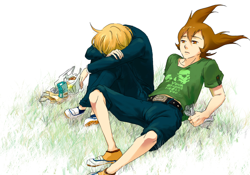 2011/04/14 Category : 妄想(パロとか) そうだ、大郷などイモだ。 たまにはあんまりあ縮小せずにうpします。お絵かきリハビリ続行中ですー3日前から描いては散漫、描いては散漫を繰り返してました…クリックしたら、でっかく見れますよそれにしても謎ですねこのシチュエーション。ピクニックにでも来てるのでしょうか?最初屋上の背景描いてたけど、めんどくさくなって芝生にしたのはナ・イ・ショなんだぜとりあえず、大郷はカオスに少なからず劣等感を抱いてると思うんですよ。カオスもそれになんとなく気づいてる。でも大郷はカオスにそんな事言いません。カオスもその事には触れません。でもたまに、大郷が、カオスを突っぱねるような言い方をするときがあってそんな時カオスは売られたケンカを買うべきか悩んでる間に大郷が自己嫌悪に陥るみたいな(^p^)幼なじみで、互いのコトよく知ってるからこそどうしようも出来なくなるような二人がそんな仲だととても胸熱です。