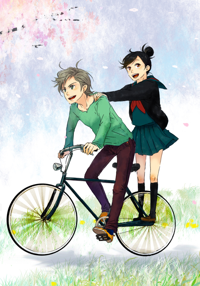 2011/04/20 Category : 妄想(パロとか) ふたりのり チャリの二人乗りってとても青春な感じがしますよね!!!やってたら高確率で警察さんに怒られるけどね!!!^^でもいいですよね〜んふふ!桜散っちゃったけど、春っぽいイラスト描いてもいいよね! PR