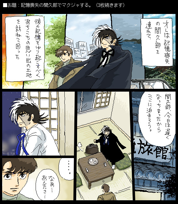 2013/02/11 Category : 絵茶ログとか ※追記再うpしました※ 絵茶ログ 記憶喪失マクジャ 一昨日くらいにしぺさんと二人篭って漫画絵茶やってきました。で、私が以前エチャで描いたマクジャ漫画が間久部の記憶喪失ネタとも取れるね!!間久部の記憶喪失ネタ描こうぜ!!ということで描いてきたのですが、その元ネタ私うpしたつもりでしたが、つもりで終わっていましたのでまずはそちらからご覧ください…オバカァ…orz12/13にやった漫画絵茶よりこれはアミダでお題を決めて書いたやつですね。昭和63年が、調べてみるとマクジャが掲載されてから約10年後ということでだったので。多少無理はある設定ですが、こういうルートもあっていいじゃない!!´;ω;`ってな感じで描いたん…だっ…‥けな…?(あやふや)で、この漫画の「黒男が金に物を言わせて間久部の身柄を引き取って〜」らへんの設定+記憶喪失で描いてきた漫画が私のは引き取って2ヶ月ってことですが、記憶喪失の度合いを幼児レベルまで下げるあたり自分の趣味丸出しだなー、我ながらどーしようもねーなーとか思いながら…wでも黒男はなんかしらの形で、昔間久部に世話してもらった恩を返したいんじゃないかと思うんですよね。そして時は今、恩返しするぜ…それはもう丁寧に、ねちっこく。ってね。毎朝毎朝、黒男が間久部にドライヤーしてポマードつけて、あの魅惑のベジェ曲線をキープしてやるんじゃないかな…と妄想は果てしなく広がりますね!!^^同じお題でしぺさんのログです〜!記憶喪失の何が辛いかって姿形は彼の人なのに、中身はまっさらな別人なことですよね…間久部が記憶喪失になったのは、頭をうったとかの類か、それとも精神的なものかわからないけど、オペの鬼がこういう手段に出ているということはきっと精神的なもので手術でどうにかなるモンじゃないなんだろうなぁ…。自分の手が届かないからこそ躍起になってさ…そりゃ黒男先生もギラッギラになりますよね…笑私達がやってる絵茶はなんてことはない、自分たちの描きたいものを黙々と描いてるだけの絵茶なのであんまり気構えず、スカートひらりせずに、興味のある方は是非とも遊びに来てくださいな〜^ω^さて以下記憶喪失とは別のネタですが、R18ログ続きます(一部性器表現も含まれます)ので畳みます。OKな方のみどうぞ〜! 続きのR18ログ