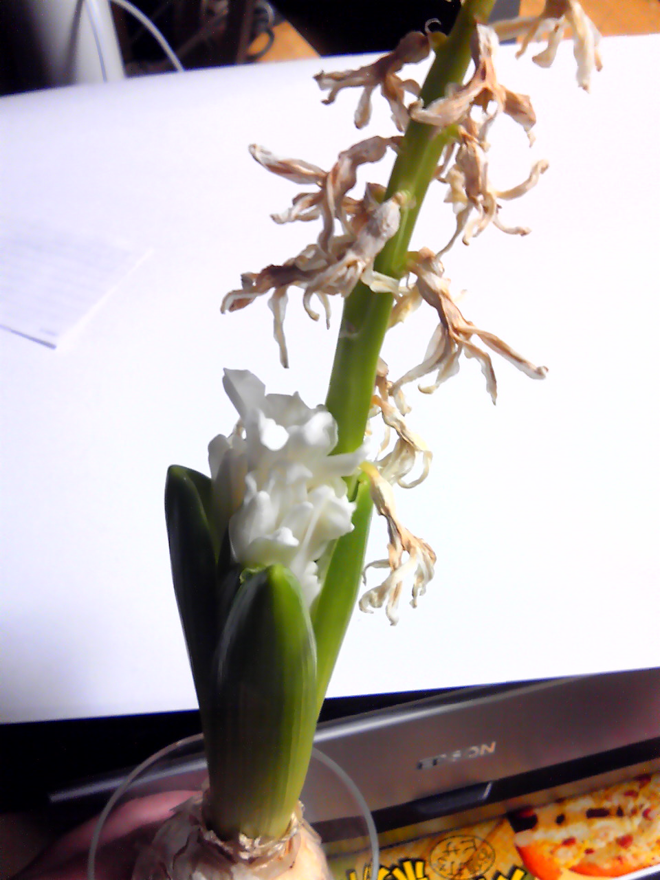 2011/02/25 Category : 携帯から お久しぶりです香子です 覚えておいででしょうか。ぽぽぎり家の愛ヒヤシンス、香子のことを2月の頭に花をつけ、咲き誇り、15日辺りからもう枯れ初めていたので話題にもあげず、私も、「来年も育てよ!うふ(´ω`)」とか見切りをつけ始めていた香子ですがつい先ほど帰宅して、部屋に入るとなにやらヒヤシンスのいい香りが枯れたヒヤシンスもいい匂いするんだぁ~なんて思って香子に視線を移すとなんか2世がでてきてる!!!!笑めっちゃびっくりしました写メだとわかりにくいかと思いますが葉っぱの背丈も伸びてます!!笑しゅ…しゅげぇえ!!!!!!!