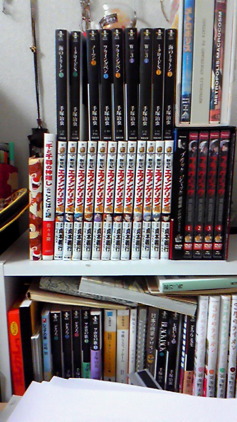 2011/12/21 Category : 携帯から 本棚(別荘) 本棚に入りきらない分、別荘という名の自室のカラーボックスに収納してたのですがそこもついにキャパ越えしちゃったってゆーね…信じられるか…?上の二段…自立させてるんだぜ…エヴァの上の秋田文庫ちゃんたちは、作業が全部おわったら読むんだ…BJOVAも…まだ買ってすらないよ…はよ見たい…。で、いっちおう27か28日には免許も、今やってる作業も全部おわりそうです…!あと一週間頑張るぞい…!!!!!