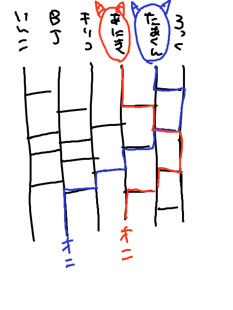 2011/02/02 Category : 日記 なん・・だと・・・? そういえば今日は節分でした。恵方巻き食べてねえ!!!節分絵を描こうと、(遅っ)鬼さん決めるアミダやったらなんと醍醐兄弟が見事当選しました。すげえw今日中に完成は無理だろうけどちょっと今から書いてきますwでき次第てブロにうpしますおーw