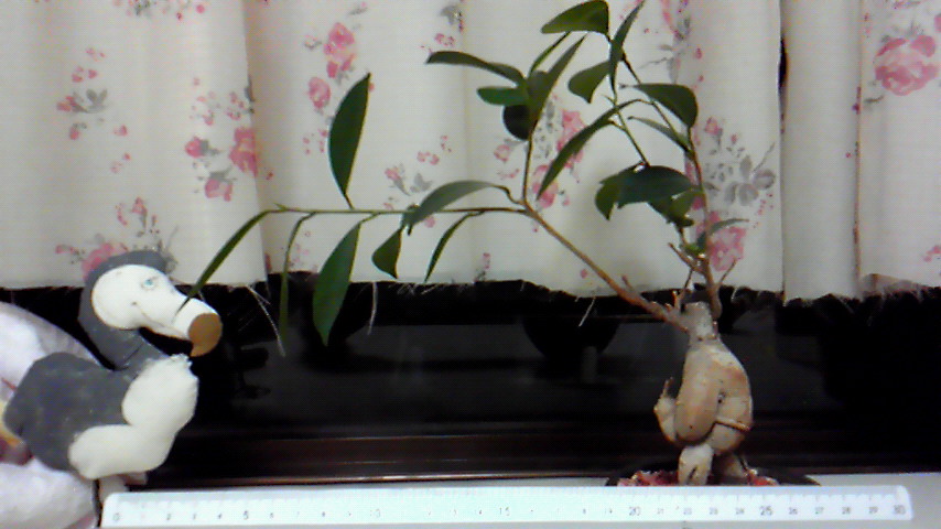 2011/10/16 Category : 携帯から ガジュたんら そういえばオフ会の時、鮎子さんに「ガジュたん元気~?」と言われたの思い出したので、ウチのガジュたんです。ガジュマルのガジュたんです。ホントに人みたいでかわいいでそ?(´ω`)身長は大体23センチくらいになりました。が、全長は26センチですWWWW(下の白っぽいバーは30センチ定規)なんかこの子、横に長くなったのよね………剪定してやんなきゃ…